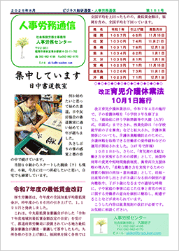 バックナンバー 2025 年 2025 年 8 月号 ビアズリー展/久留米市美術館 コラム:被爆 80 年の夏 2025 年 7 月号 2000年ハス/佐賀・みやき町千栗土井公園 賞与支給と賞与支払い届 レシピ:白ナスのバターポン酢 2025 年 6 月号 3連水車活動開始/福岡・朝倉 社会保険算定基礎届の質問に答えて 2025 年 5 月号 バラが次々と咲く/久留米市石橋文化センター 社会保険算定基礎届/労働保険年度更新 レシピ:ゆでホワイトアスパラ 2025 年 4 月号 桜満開・春爛漫/福岡県朝倉市秋月野鳥 法改正:改正育児・介護休業法 レシピ:若竹煮 2025 年 3 月号 ミモザの花/3・8国際女性デー 足し算で生きる~がんステージ4からの生還~ 雇用保険料率の改訂/令和7年4月から 2025 年 2 月号 節分祭/福岡市博多区東長寺 令和7年度健保・厚年保険料改訂3月分給与から徴収控除4月納付 柳川雛祭り“さげもんめぐり” レシピ:雲仙ハムときのことブロッコリー 2025 年 1 月号 十日恵美須祭/山王宮日吉神社 壱岐高校/春の選抜高校野球に出場